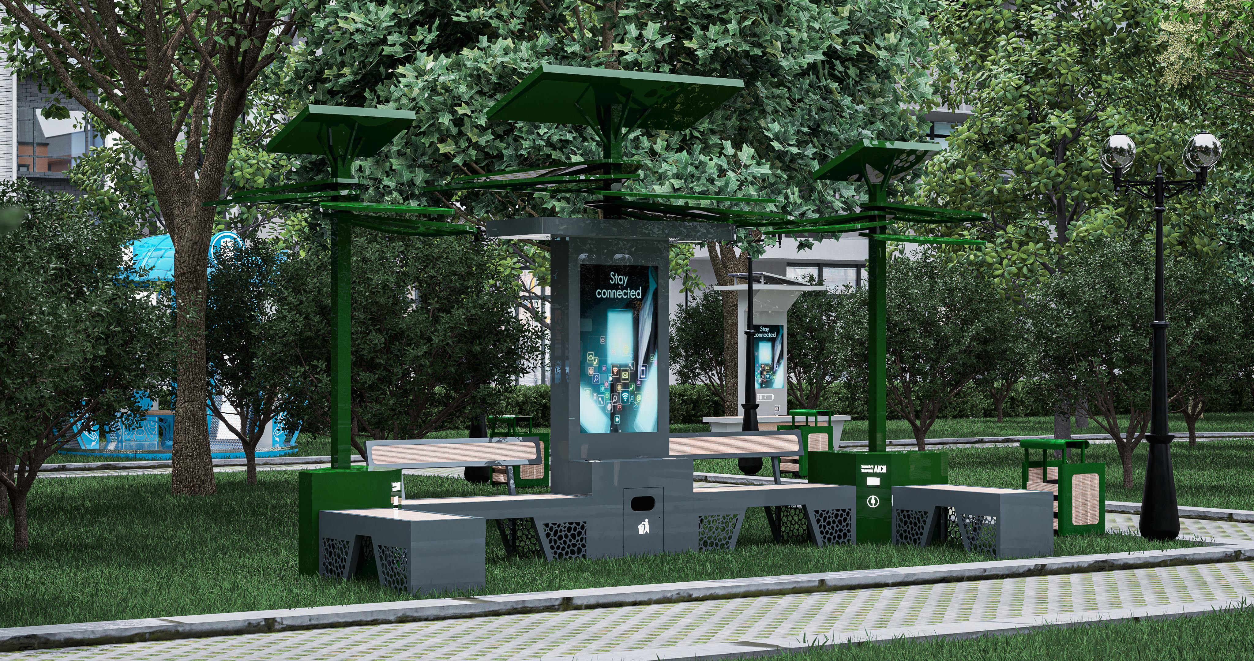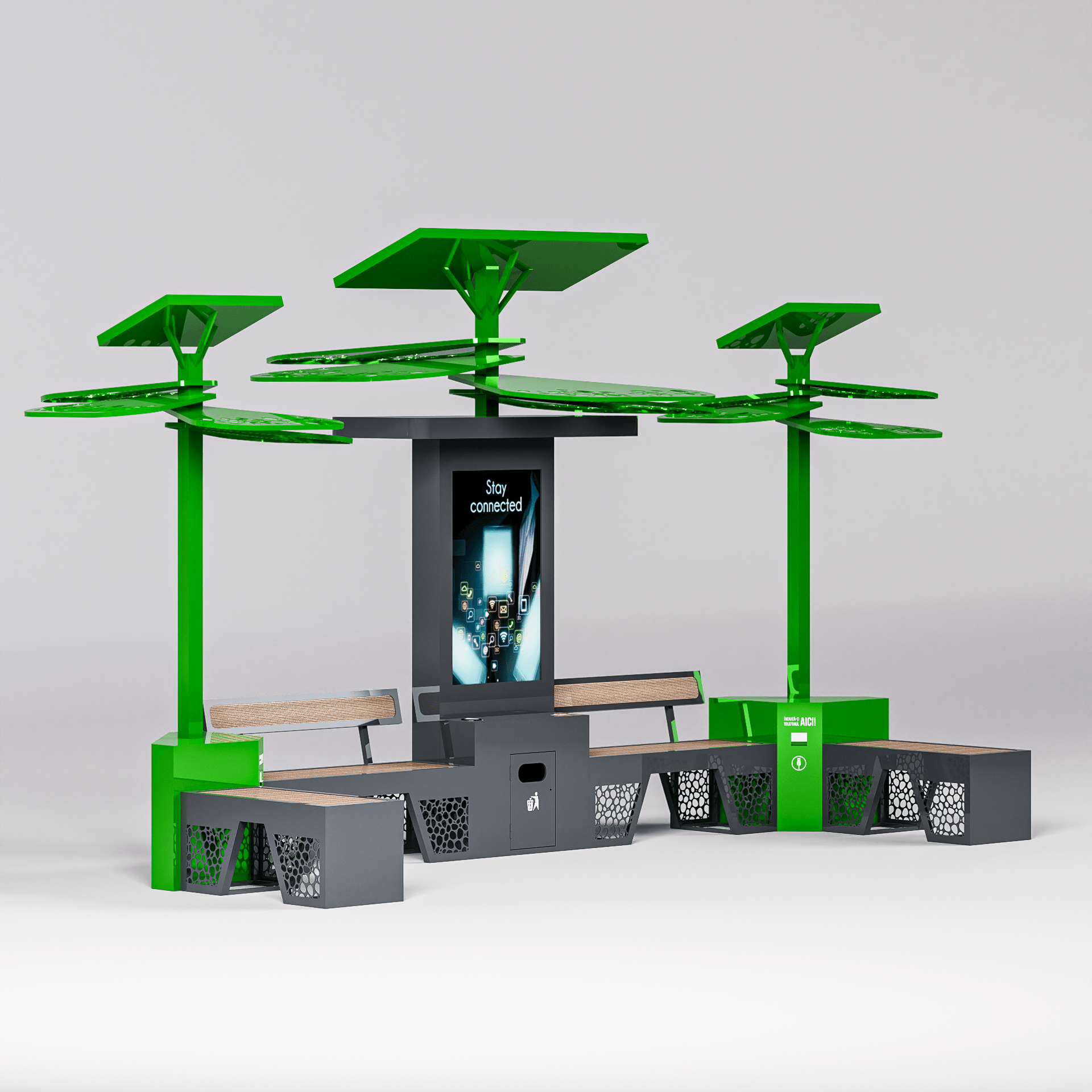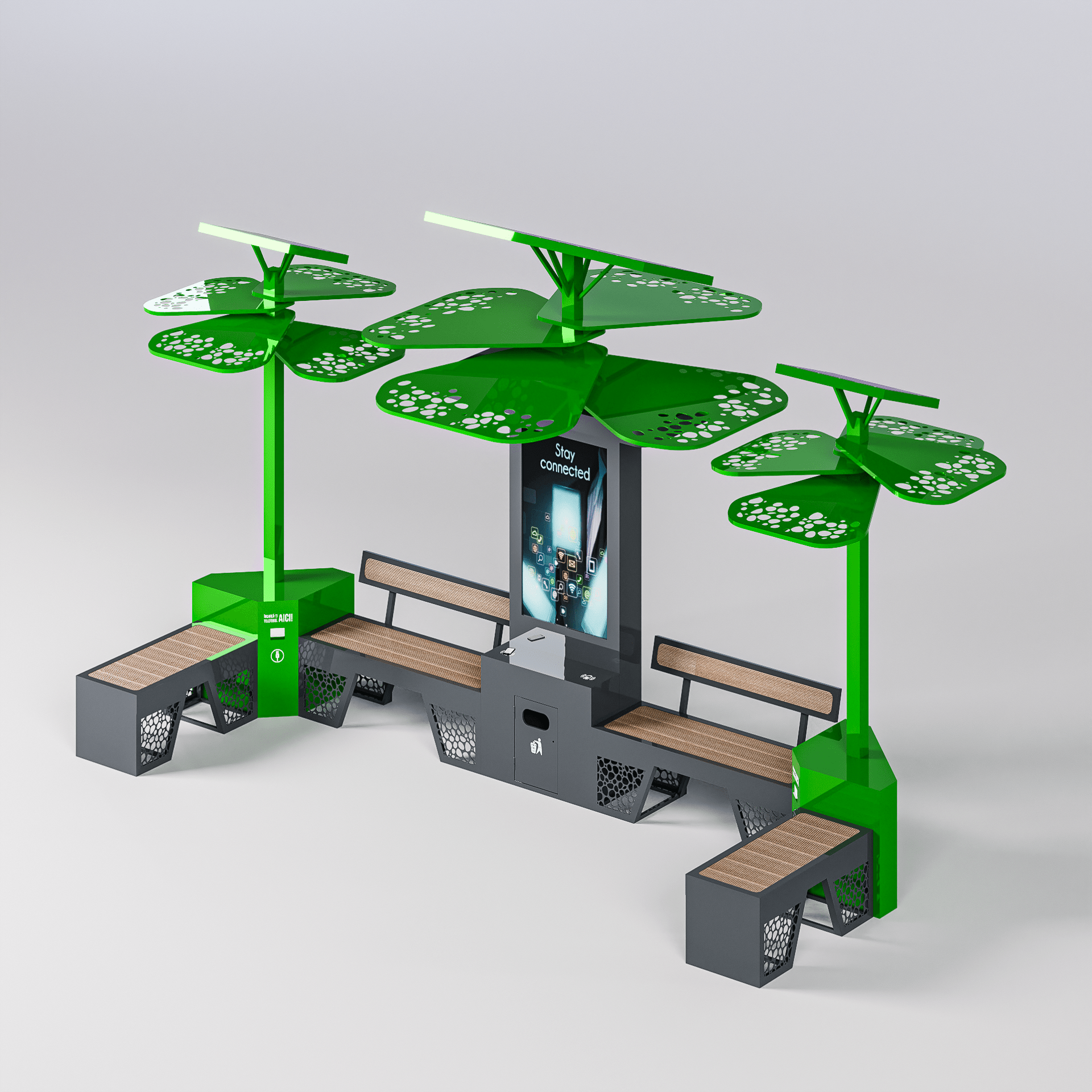 Aceste banci inteligente Green Evolution sunt modulare și pot fi personalizate pentru a se potrivi oricărui spațiu public. Fie că este vorba de parcuri, piețe sau zone pietonale, acest ansamblu de bănci smart se integrează armonios în peisajul urban, oferind un spațiu de relaxare adaptat nevoilor comunității. Designul modular permite configurarea rapidă și ușoară, oferind flexibilitate maximă în utilizare.