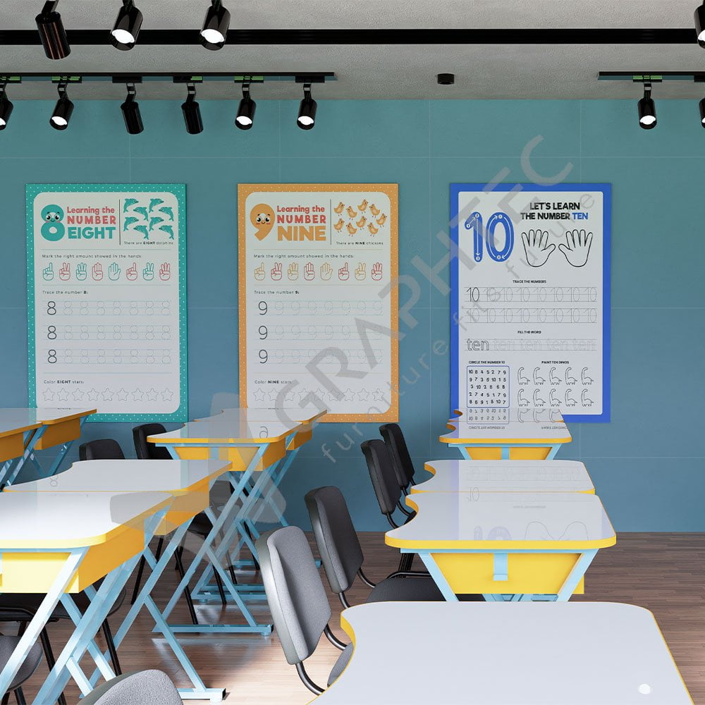 Paleta cromatică jucăușă, cu nuanțe de portocaliu și albastru, aduce un plus de bună dispoziție și energie în clasă. Aceste culori nu doar că înfrumusețează spațiul, dar și încurajează un sentiment de încredere și optimism în rândul elevilor.