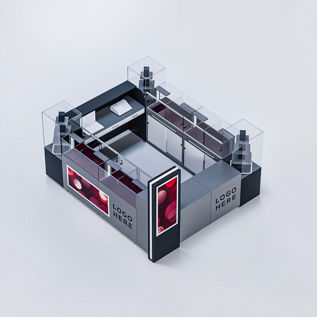 Cu un totem de tip casetă luminoasă dublă față și logo din litere luminoase încastrate, insula comercială mall AMBER atrage atenția clienților și le îmbunătățește experiența de cumpărare. Vitrinele sunt securizate cu yală, iar modulele de stocare sunt perfect integrate pentru a facilita procesul de vânzare.