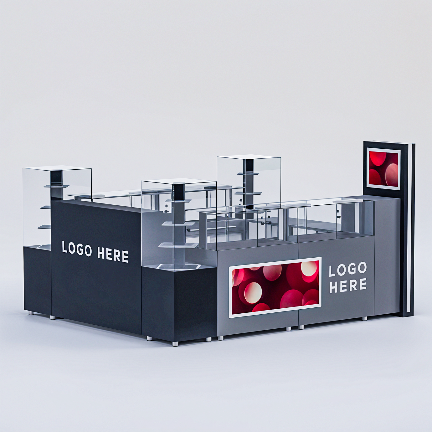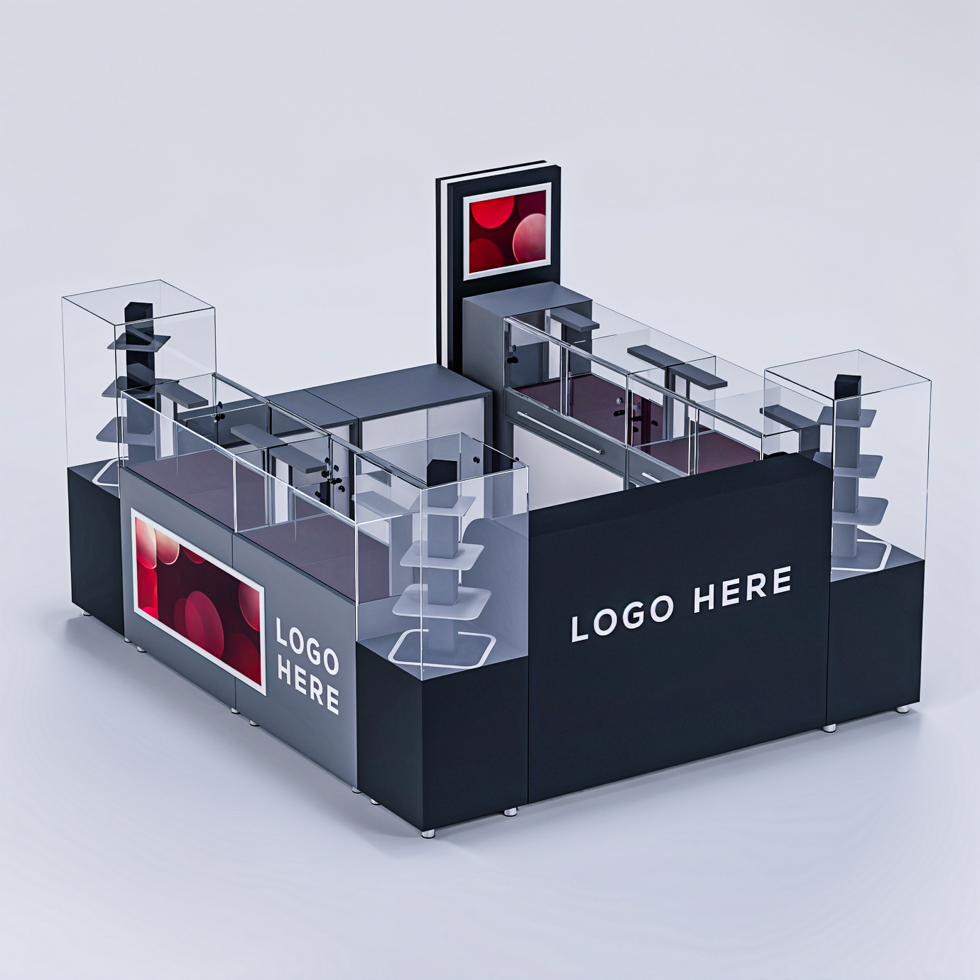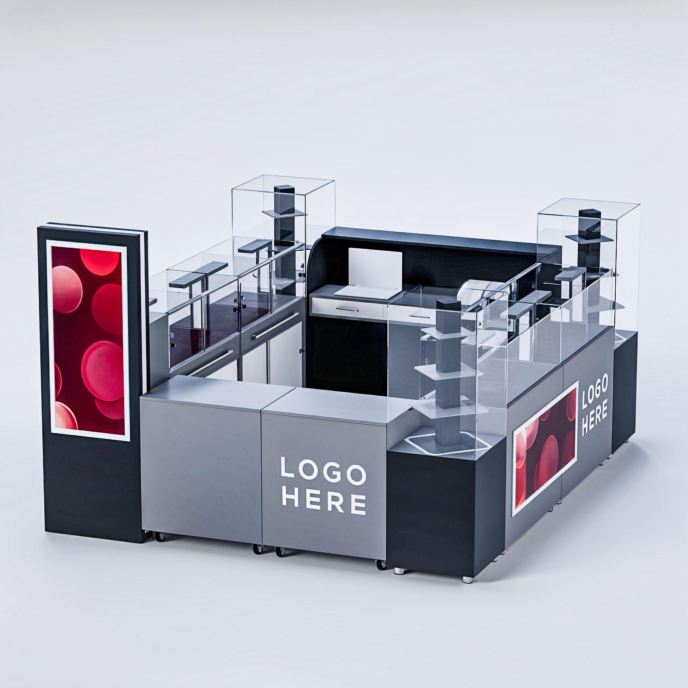 Plexiglasul adaugă un strat suplimentar de protecție și rafinament, contribuind la un design elegant și sofisticat. Autocolantul este utilizat pentru personalizarea insulei, reflectând identitatea vizuală a brandului tău într-un mod atractiv. Profilele din aluminiu și tabla de aluminiu conferă structurii robustețe și stabilitate, garantând o utilizare îndelungată și rezistență la uzura zilnică. Aceste materiale nu doar că asigură o performanță superioară, dar și contribuie la crearea unui spațiu de vânzare profesionist și atractiv, ideal pentru a maximiza vizibilitatea și accesibilitatea produselor tale în orice mall sau zonă comercială.