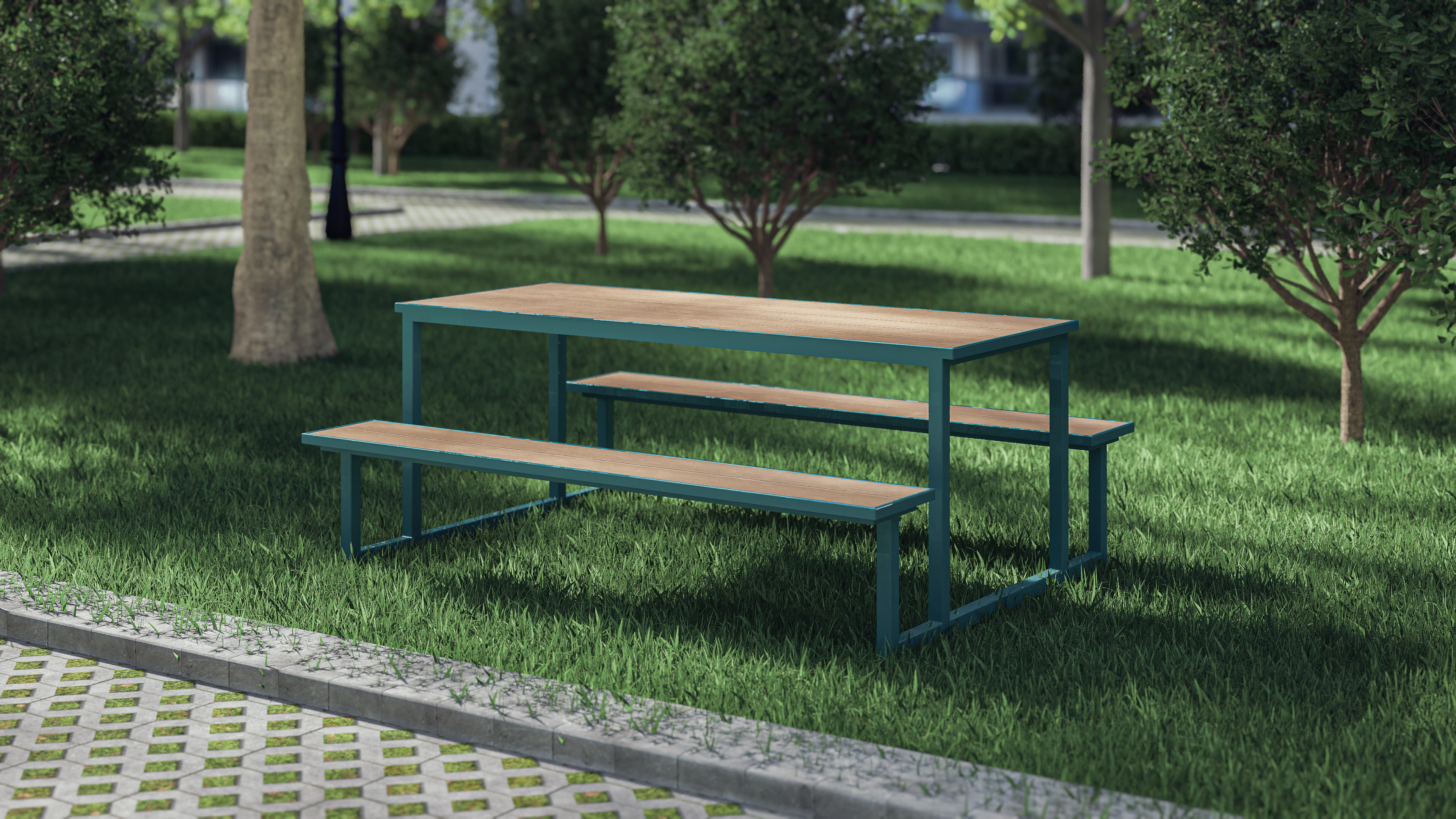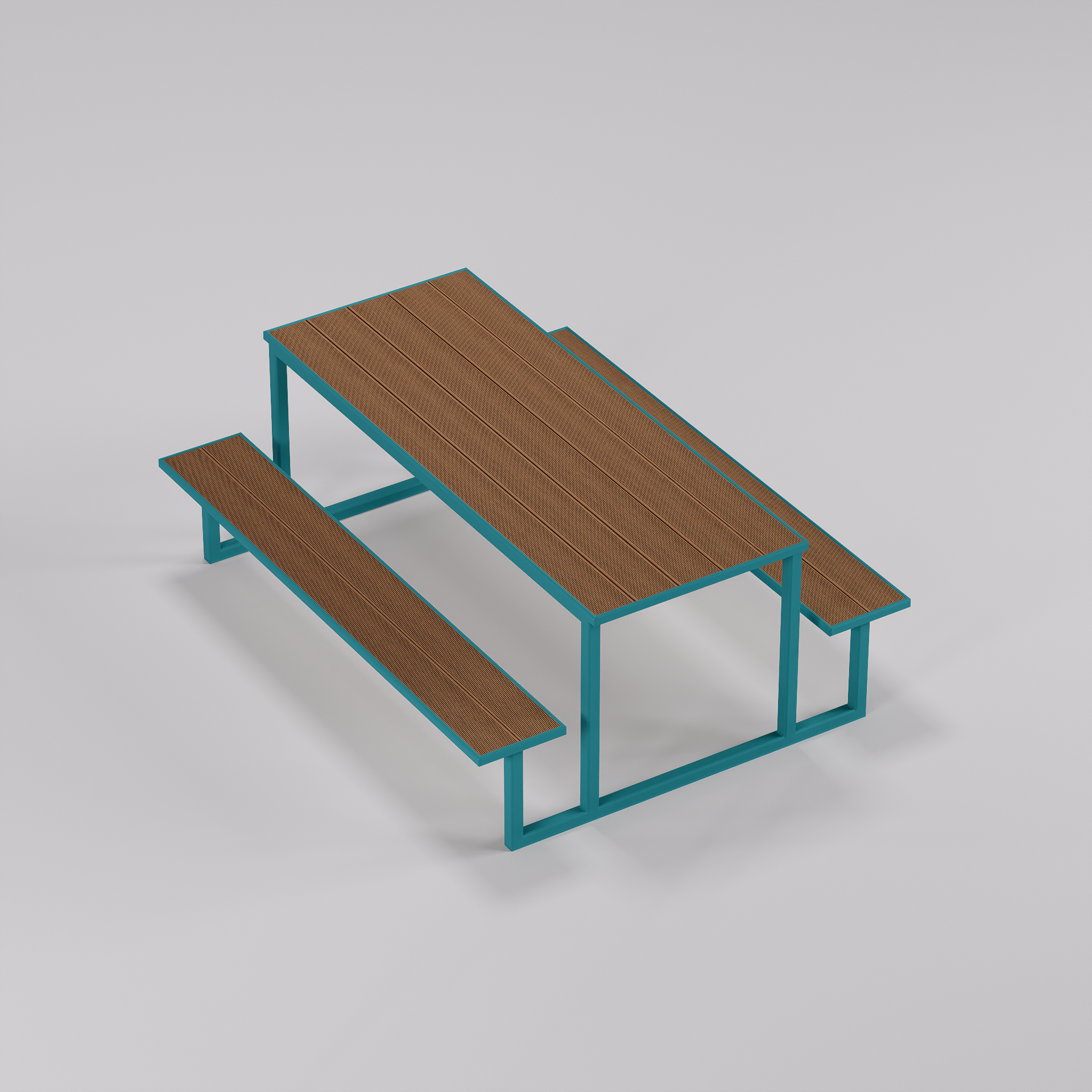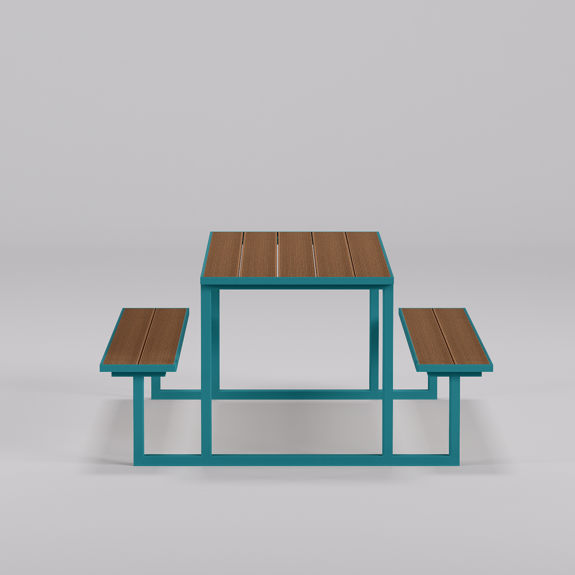 - Materiale: Structură metalică vopsită electrostatic; bănci și masă din WPC (Wood Plastic Composite)