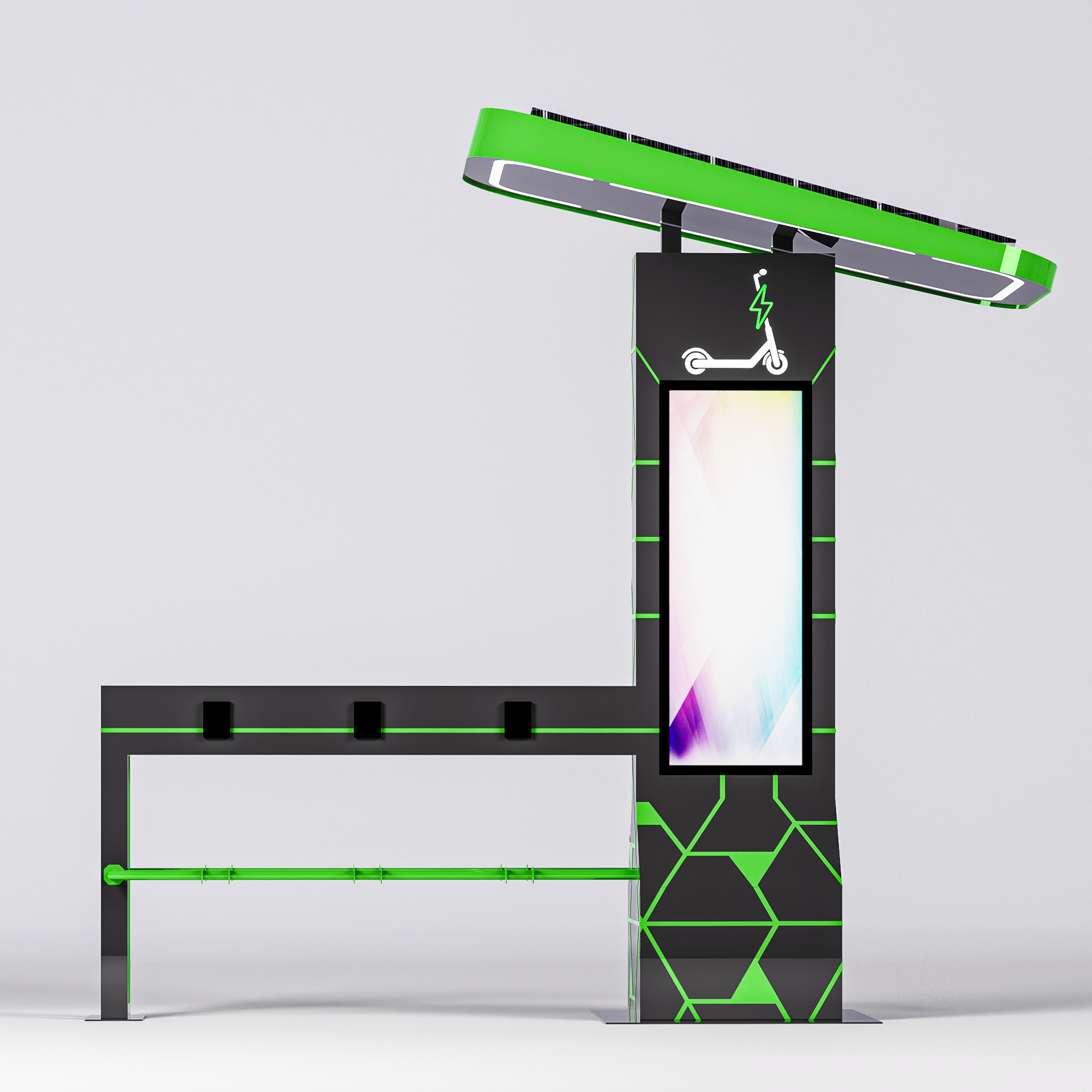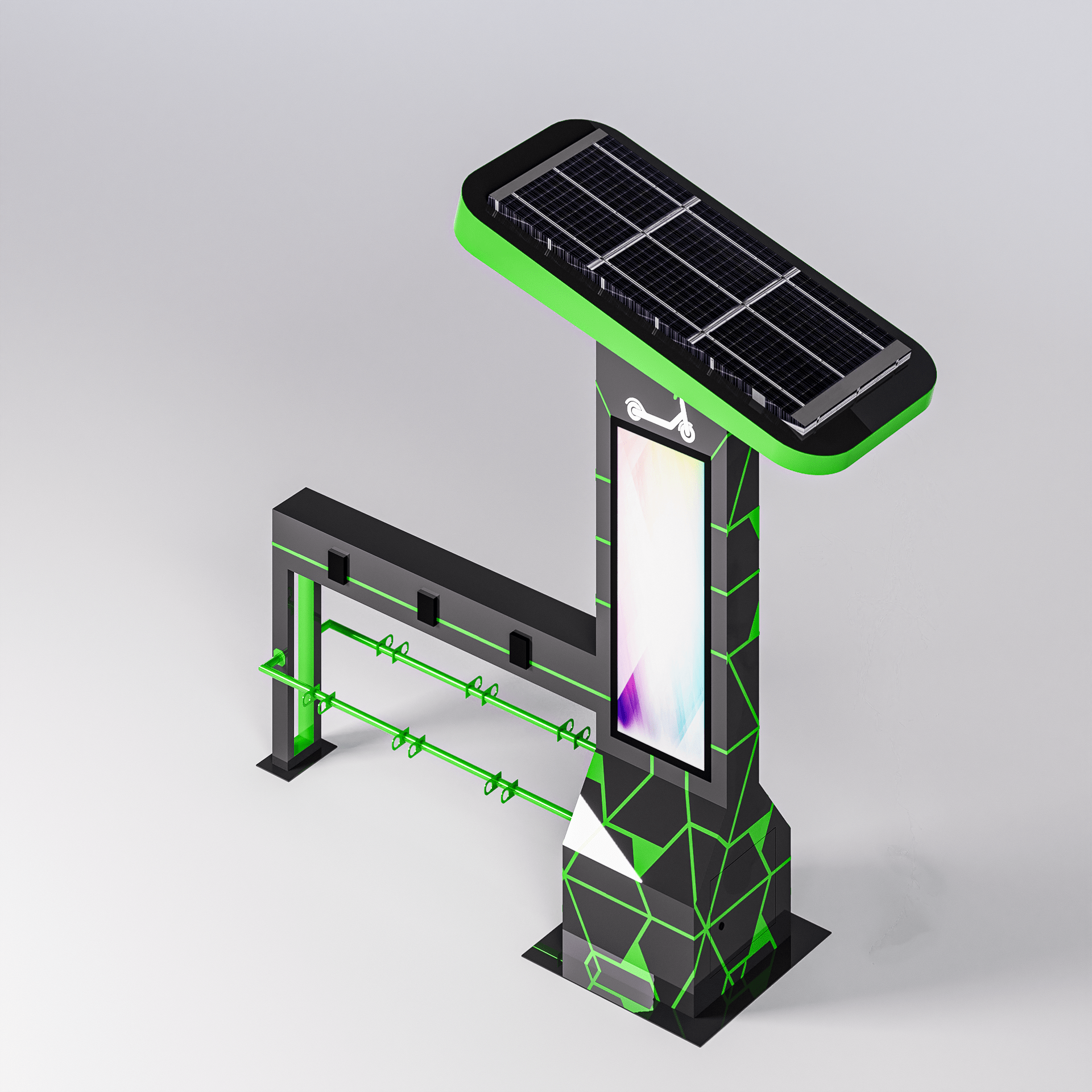 Această statie incarcare trotineta electrica Green Light este proiectată pentru a susține mobilitatea urbană printr-o soluție ecologică. Alimentată de panouri fotovoltaice, stația oferă o metodă de încărcare sustenabilă, reducând dependența de rețeaua electrică tradițională și promovând utilizarea energiei regenerabile.