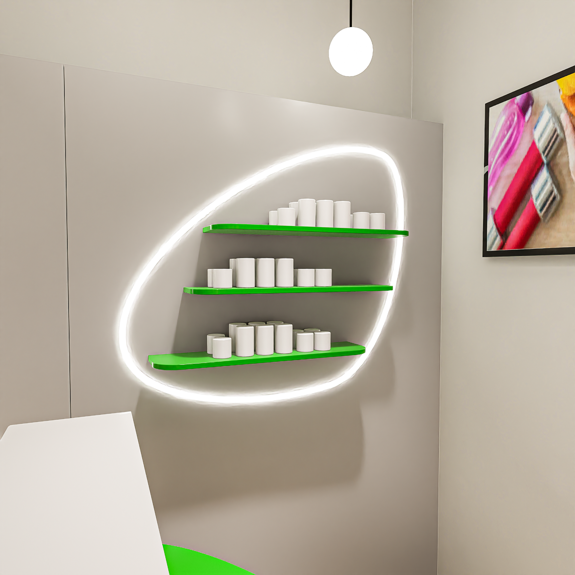 În jurul celor trei polițe verzi, o formă luminoasă rotunjită creează un efect vizual deosebit, atrăgând imediat atenția asupra produselor expuse. Această iluminare LED subtilă nu doar că evidențiază produsele, dar și îmbunătățește atmosfera generală din farmacie, conferindu-i un aspect contemporan și primitor.