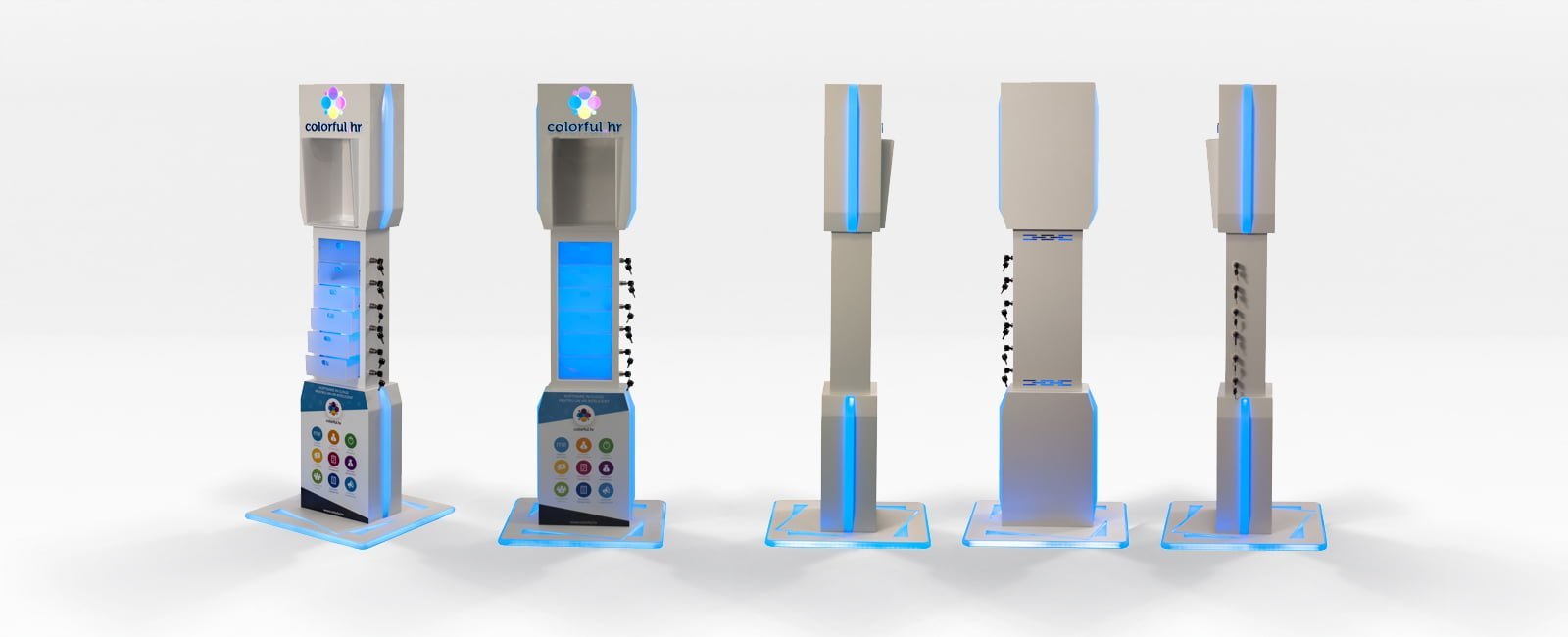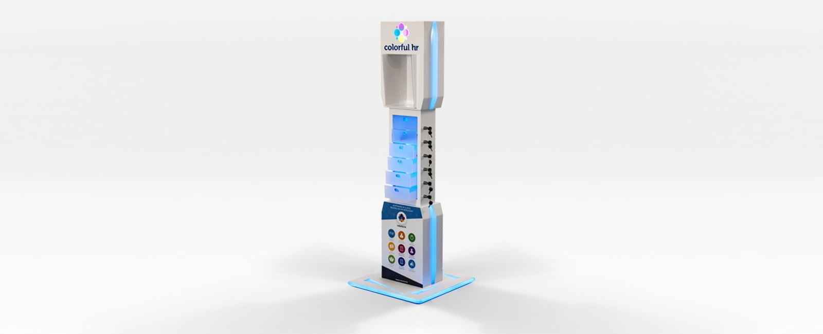Innovatives Ladegerät, das die Möglichkeit bietet, den Körper in 4 Module zu zerlegen und einfach zu transportieren und zu lagern. Das Ladegerät verfügt über eine Sicherheitsfunktion, mit der Sie Ihr Telefon sichern und später zurückgehen können. Die RGBW-Beleuchtung ermöglicht eine Vielzahl von Animationen, die dem Körper eine flüssige Wirkung verleihen und einen organischen Effekt erzeugen. Die Designsprache komplimentiert die Funktionen des Ladegeräts. Dieses Produkt wurde entwickelt, um Sichtbarkeit, Einfühlungsvermögen bei den Kunden und einen unvergesslichen Service zu bieten.